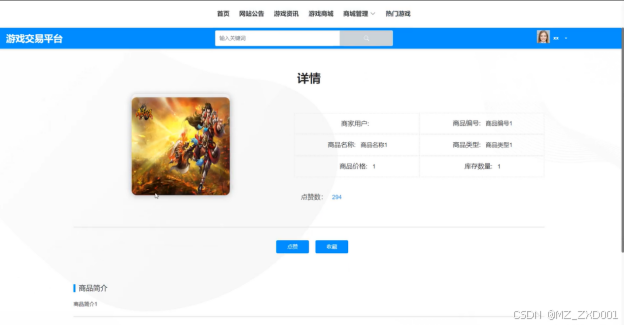 用户点击“热门游戏”,可以查看系统发布的所有热门游戏信息,点击可查看详情,包括商家编号、商品名称、商品价格、库存数量等,用户可以进行点赞、收藏、评论。界面如下图所示。