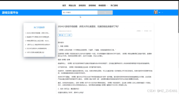 用户点击“游戏资讯”,可以查看系统发布的所有游戏资讯信息,点击可查看详情,用户可以进行点赞、收藏、评论。界面如下图所示。