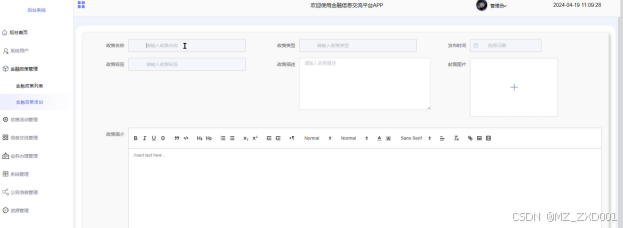 金融政策管理:管理员点击可查看金融政策列表和金融政策添加;点击“金融政策添加”,输入政策标题、政策类型,选择发布时间,输入政策标签、政策描述,上传封面图片和输入政策介绍,点击“提交”按钮进行添加;同时可对用户添加的政策讲解进行审核回复。界面如下图所示。