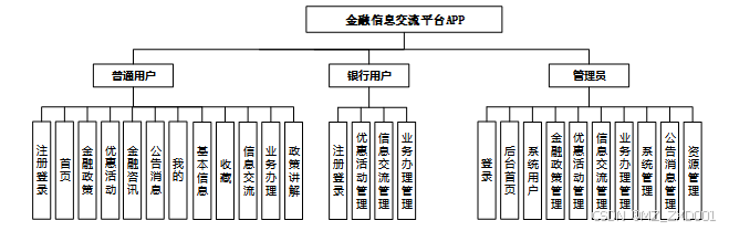 金融信息交流平台APP分为三大部分:管理员、普通用户和学生用户。