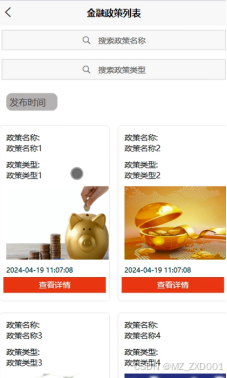 (3)金融政策:用户点击可通过搜索政策名称和政策类型进行查看金融政策列表,同时可进行收藏操作。