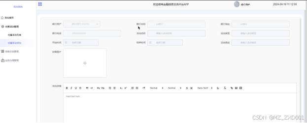 优惠活动管理:银行用户点击可查看优惠活动列表和优惠活动添加;点击“优惠活动添加”,输入活动名称、活动类型,选择开始时间和结束时间,输入活动描述,上传封面图片和输入活动详情,点击“提交”按钮进行添加。界面如下图所示。