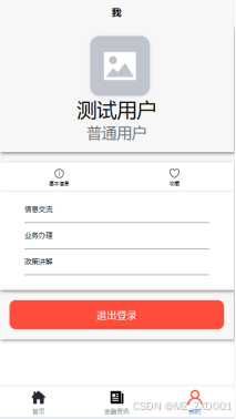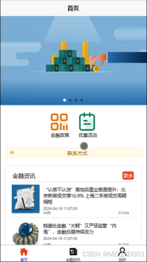 (2)首页:当进入金融信息交流平台APP的时候,首先映入眼帘的是系统的导航栏,导航栏下面是首页、金融政策、优惠活动、金融咨讯和我的基本信息和收藏等内容。