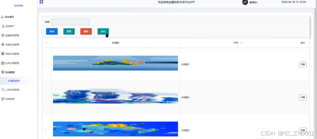 (7)系统管理:当管理员点击”系统管理“这一菜单时,可查看轮播图管理,如需添加新的轮播图,点击下方”添加“按钮,上传轮播图,填写标题,点击“提交”按钮进行添加。同时管理员可对轮播图进行增删改查。