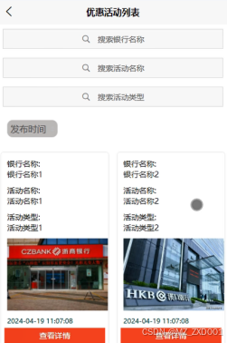 优惠活动:用户点击可通过搜索银行名称、活动名称和活动类型进行查看优惠活动列表,同时可进行收藏、评论、办理业务和信息交流操作。如下图所示。