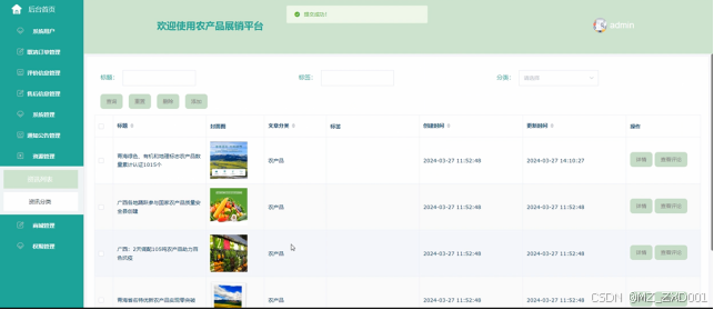 管理员点击“资源管理”这个菜单,可以管理发布的农产品资讯信息,包括添加、编辑和删除资讯,还可以管理农产品资讯的分类信息,确保资讯的整体管理和整理。资源管理界面如下图所示。