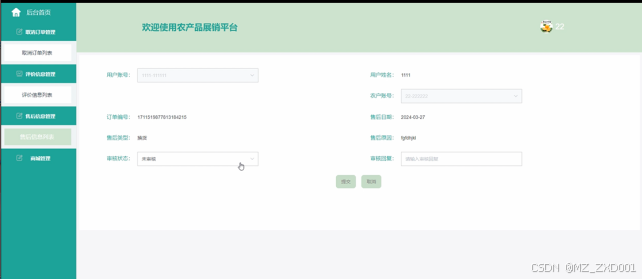 这个系统使用MySQL数据,springboot语言,采用springboot框架。系统基本实现:后台首页、系统用户、取消订单管理、评价信息管理、售后信息管理、系统管理(轮播图管理)、通知公告管理、资源管理(农产品资讯、资讯分类)、商城管理(商城中心、分类列表、订单列表、订单配送)、权限管理等功能模块。系统功能流畅、模块清晰,易于更改后期版本的程序细节,实现了效率高与界面友好还有操作方便。