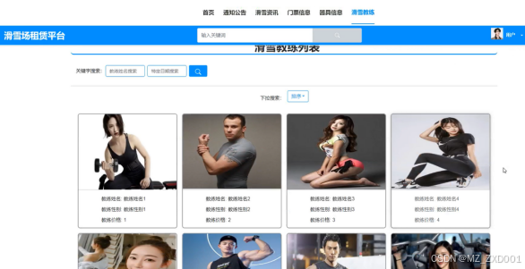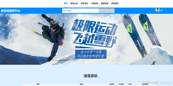 当用户进入滑雪场租赁平台的时候,首先映入眼帘的是系统的首页,首页展示的项目有通知公告、滑雪资讯、门票信息、器具信息、滑雪教练、我的账号、个人中心等内容,首页主界面展示如下图所示。