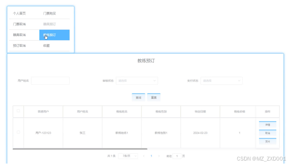 通过教练预订管理页面,管理员管理、维护教练预订,可以查看用户姓名、教练姓名、教练性别、特定日期、教练价格、预定人数等信息,教练预订列表界面如下图所示。