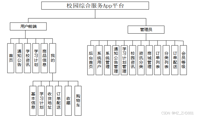 按照校园综合服务App平台的角色,主要包括普通用户模块和管理员这两大功能模块,各模块功能内容如下: