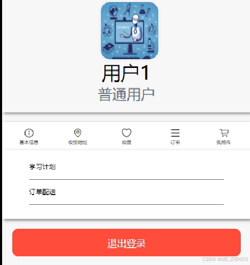 用户点页面下方“我的”进入我的页面可以修改密码和个人信息,可以查看和管理订单、学习计划、购物车、地址信息。点击“地址”进入页面后点击“新增地址”填写联系人、手机号、地址、开启默认按钮后点击“提交”即可完成地址的新增。点击商品订单下方的“订单配送”进入页面可以查看所有订单信息,已收货的订单可以点击“确认收货”,确认收货后点击“评论”可以对商品进行评论,点击“学习计划”可查看自己制定的学习计划信息。其界面如图4-5所示。
