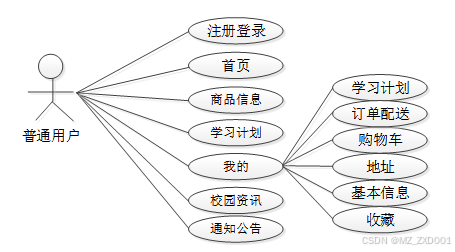 - 我的:用户点页面下方“我的”进入我的页面可以修改密码和个人信息,可以查看和管理订单、学习计划、购物车、地址信息。点击“地址”进入页面后点击“新增地址”填写联系人、手机号、地址、开启默认按钮后点击“提交”即可完成地址的新增。点击商品订单下方的“订单配送”进入页面可以查看所有订单信息,已收货的订单可以点击“确认收货”,确认收货后点击“评论”可以对商品进行评论,点击“学习计划”可查看自己制定的学习计划信息。