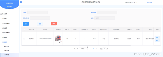 管理员可以查看商品订单列表信息,点击某一订单后面的“详情”可以查看该订单的详细信息,点击“配送”可为用户的订单安排配送。其界面如下图4-10所示。