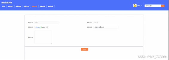 (5)请假申请:用户点击可填写请假申请信息,包括学生名称、请假学生、请假时间、请假原因和请假详情。