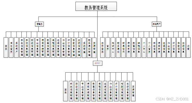 系功能模块的设计就是把系统具体要实现哪些功能,功能如何划分做一个系统的架构,以模块图的方式展示出来,方便我们进行功能得罗列以及涉及。在系统的功能方面,项目分成了管理员+学生用户+教师用户三个模块,每个模块登录进去对应相应的功能,具体的功能模块图如图3.1所示。