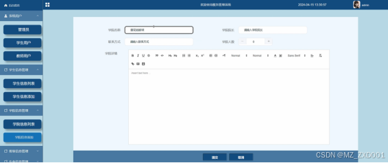 学院信息管理:管理员点击可查看学院信息列表和学院信息添加;点击“学院信息添加”,输入学院名称、学院院长、联系方式、学院人数和学院详情,点击“提交”按钮进行添加。界面图如下。