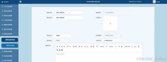 课程信息管理:用户点击可查看课程信息列表和课程信息添加;点击“课程信息添加”,数额课程名称、课程编号、课程类型,上传封面图片,选择课程状态,选择授课老师,输入教师姓名,选择发布时间和输入课程详情,点击“提交”按钮进行添加。界面如下图所示。