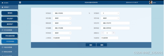 (4)学生信息管理:管理员点击可查看学生信息列表和学生信息添加;点击“学生信息添加”,输入学生姓名,选择学生账号、学生学院、学生专业、班级名称,输入学生学号、学生邮箱、联系电话,选择学生性别,输入成绩总分,选择入学时间和毕业时间,点击“提交”按钮进行添加。