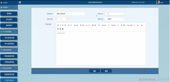 班级信息管理:管理员点击可查看班级信息列表和班级信息添加;点击“班级信息添加”,输入班级名称,选择班级主任,输入班级人数,选择班级人数和班级详情,点击“提交”按钮进行添加。界面图如下。
