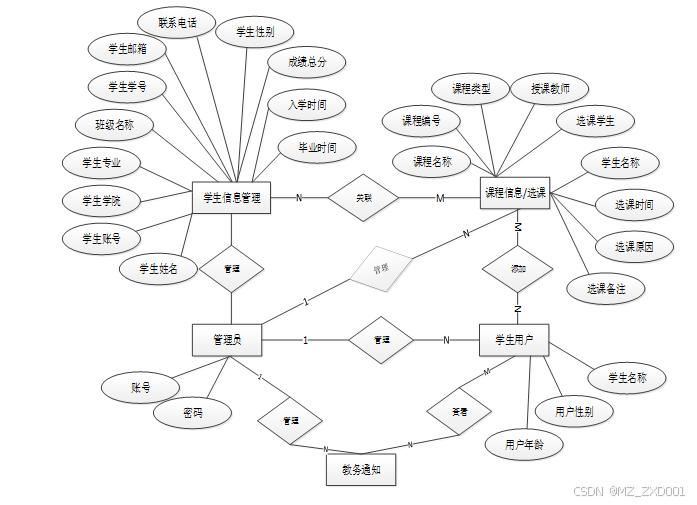 下面是整个教务管理系统中主要的数据库表总E-R实体关系图。