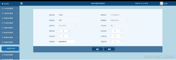 (8)选课信息管理:用户点击可查看选课信息列表,点击“记录考勤”可填写学生考勤信息,包括请假次数、迟到次数、早退次数、旷课次数、考勤时间和考勤详情。点击“公布成绩”可填写学生成绩信息,包括平时分数、期末分数、合计分数和成绩详情。