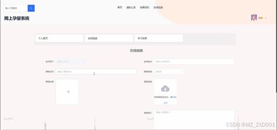 (4)个人中心:老师点击头像可查看“个人中心”,包括个人首页、在线视频和学习信息。点击“在线视频”,输入老师姓名、课程名称,选择课程类型,上传课程封面和课程视频,输入课程简介,点击“提交”按钮进行添加。