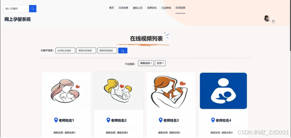 在线视频:用户点击可通过搜索老师姓名、课程名称和乐从类型进行查看视频详情,同时可对视频进行点赞、收藏、评论和学习操作。界面图如下。