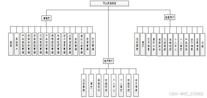 系功能模块的设计就是把系统具体要实现哪些功能,功能如何划分做一个系统的架构,以模块图的方式展示出来,方便我们进行功能得罗列以及涉及。在系统的功能方面,项目分成了管理员+老师用户+普通用户三个模块,每个模块登录进去对应相应的功能,具体的功能模块图如图3.1所示。