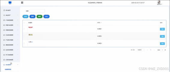 系统管理:当管理员点击“系统管理”时,可查看轮播图; 如需添加新的轮播图,点击右侧“添加”按钮,上传图片,输入标题,点击“确认”按钮进行添加;同时可对轮播图进行增删改查。界面图如下。