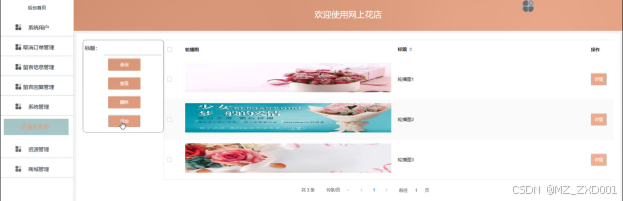 系统管理:当管理员点击“系统管理”时,可查看轮播图; 如需添加新的轮播图,点击右侧“添加”按钮,上传图片,输入标题,点击“确认”按钮进行添加;同时可对轮播图进行增删改查。其界面如下图所示。