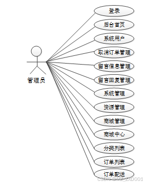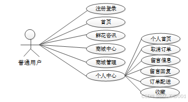 通过2.3功能的分析,得出了本基于 SSM 的网上花店的角色用例图: