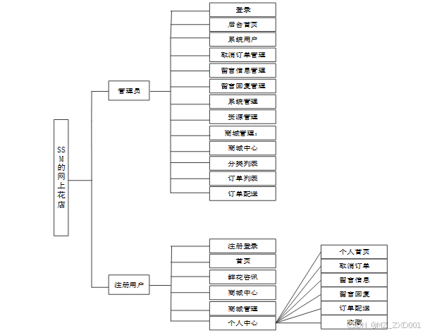 按照基于 SSM 的网上花店的角色,主要包括普通用户模块和管理员这两大功能模块,各模块功能内容如下: