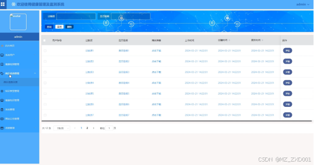 - 健康检测管理:可查看所有健康检测信息,进行增改删查操作,支持用户身高、用户体重、用户血型搜索,可点击查看详情,并可点击病例上传。