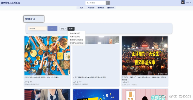 - 健康资讯:可查看管理员发布的所有健康资讯信息,支持局部搜索和下拉(筛选、排序)搜索,热门文章推荐,点击可查看详情,进行点赞、收藏和评论。