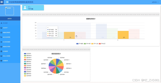 - 后台首页:管理员登录系统后台后,首先进入后台首页界面,可查看健康检测、病例信息等统计信息数据分析图表。