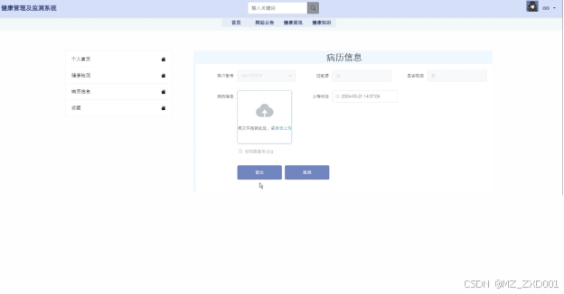 - 个人中心:可对个人首页、健康检测、病例信息、收藏等信息进行管控。例如,点击“健康检测”,可查看自己的所有健康检测信息,进行查询操作,支持用户身高、用户体重、用户血型搜索,可点击查看详情;点击“病例信息”,可查看自己的所有病例信息,进行增改删查操作,支持过敏源、是否吸烟搜索,可点击查看详情;点击“收藏”,可管理所有收藏信息,包括健康资讯、健康知识等收藏信息,进行查看和删除操作,点击可查看详情。