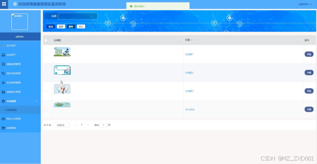 - 系统管理:可对首页的轮播图进行管理,进行增删改查操作,支持标题搜索,可点击查看详情。