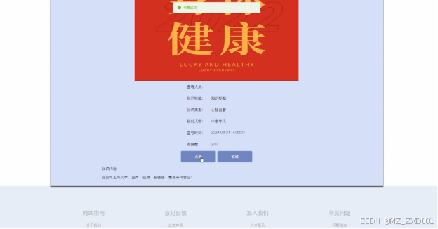 - 健康知识:可查看发布的所有健康知识信息,支持关键字搜索和下拉排序搜索,点击可查看详情,可进行点赞、收藏。