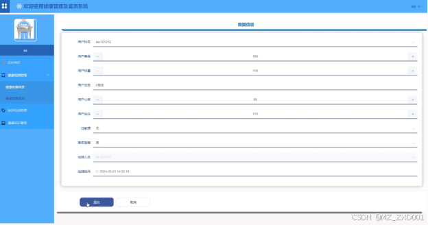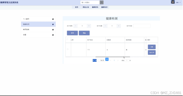 - 健康检测管理:可查看自己的所有健康检测信息,进行增改删查操作,支持用户身高、用户体重、用户血型搜索,可点击查看详情。
