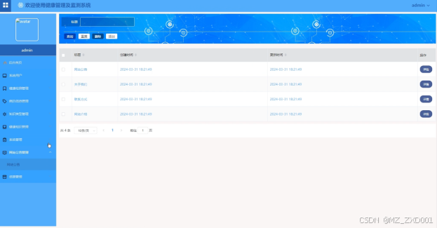 - 网站公告管理:可对网站公告进行管理,进行增删改查操作,支持标题搜索,可点击查看详情。