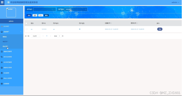 - 系统用户:可对普通用户、医生用户和管理员进行管控,进行增改删查操作,可点击查看详情。