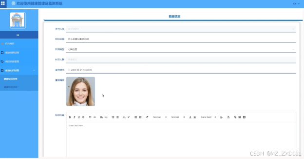 - 健康知识管理:可查看所有健康知识信息,进行增改删查操作,可点击查看详情。