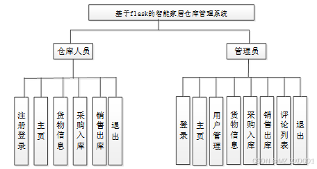 基于flask的智能家居仓库管理系统整体的功能模块包括管理员+普通用户两个模块,实现了对智能家居仓库管理系统相关信息的查询管理,系统功能模块如图所示。