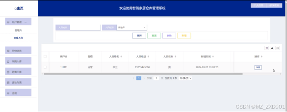 智能家居仓库管理系统中的管理员在“用户管理”这一菜单是中可以对注册的仓管人员以及管理员人员进行管控。界面如下图4.10所示。