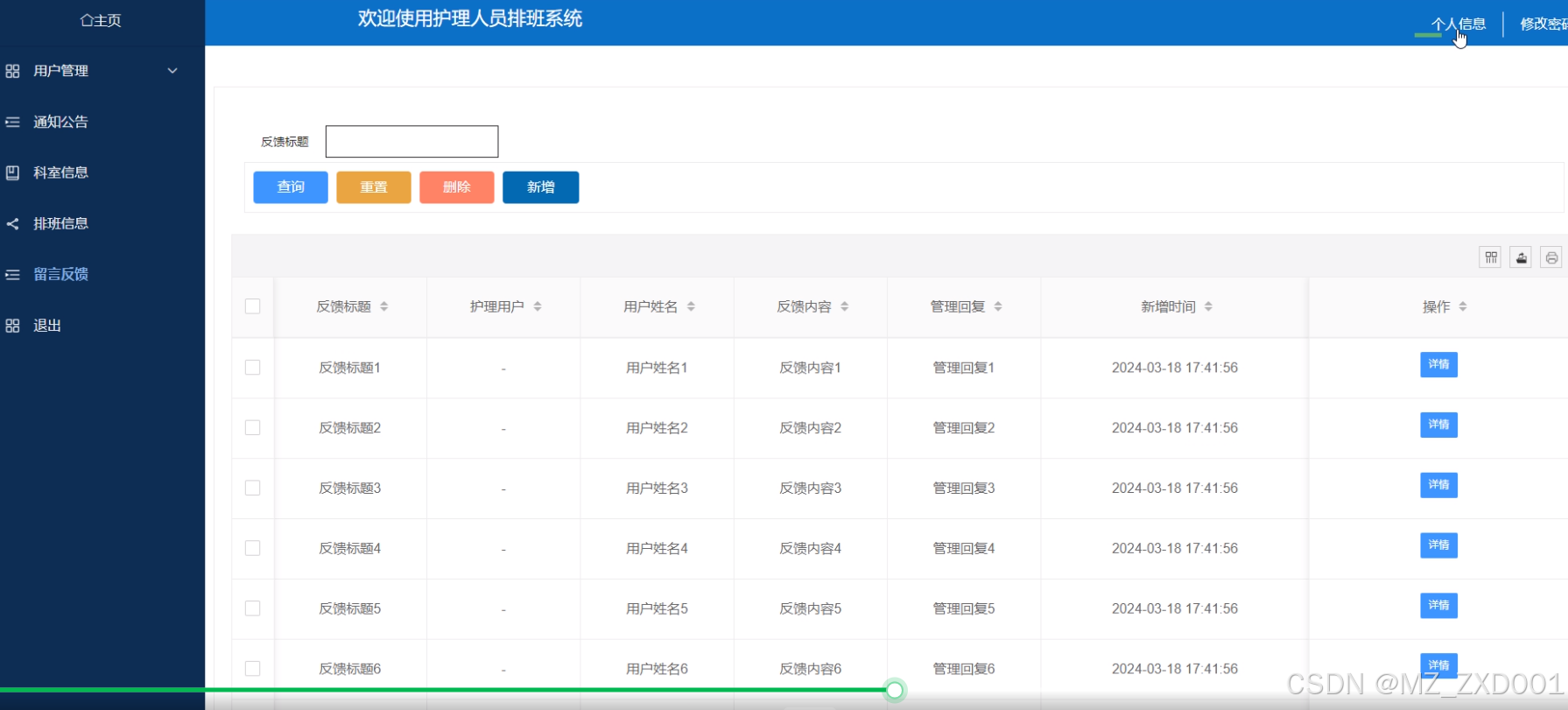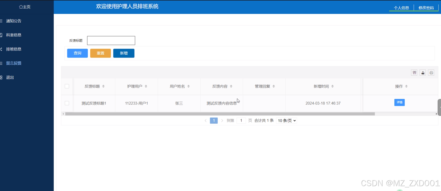 留言反馈,管理员可以查看护理人员的留言反馈,及时回复和处理护理人员的问题和建议。如下图所示。
