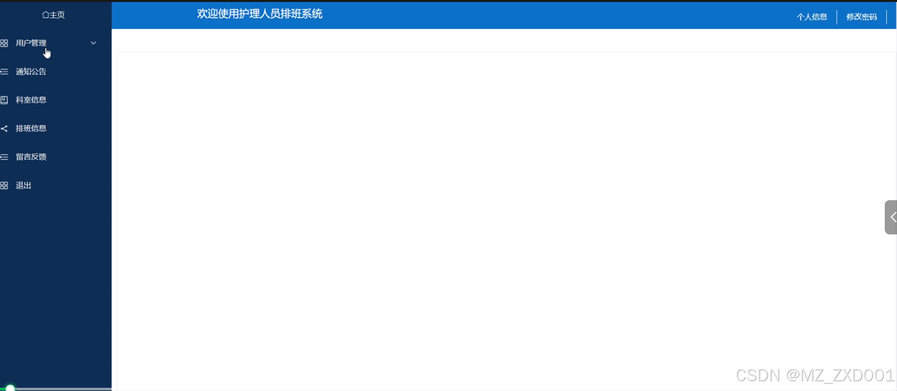 管理员登录进入护理人员排班系统可以查看主页、用户管理、通知公告、科室信息、排班信息、留言反馈等信息,如下图所示。