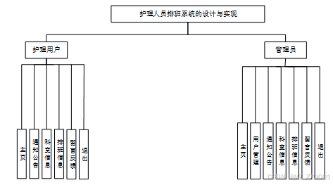 (3)确定好系统使用的技术,进行在线确认系统所划分的用户角色,并且根据用户角色划分确定所要设计的功能模块,对护理人员排班系统的设计主要划分别为管理员和用户角色,并所使用的功能模块也相应不同,但是系统的数据库实现的内容是交互的,用户可以随时根据自己的需求查询排班信息,对于系统工作人员可以根据自己的分管内容进行在线信息的处理及操作,管理员获取到所有用户的详细数据信息,并根据需求进行第一时间处理解决。