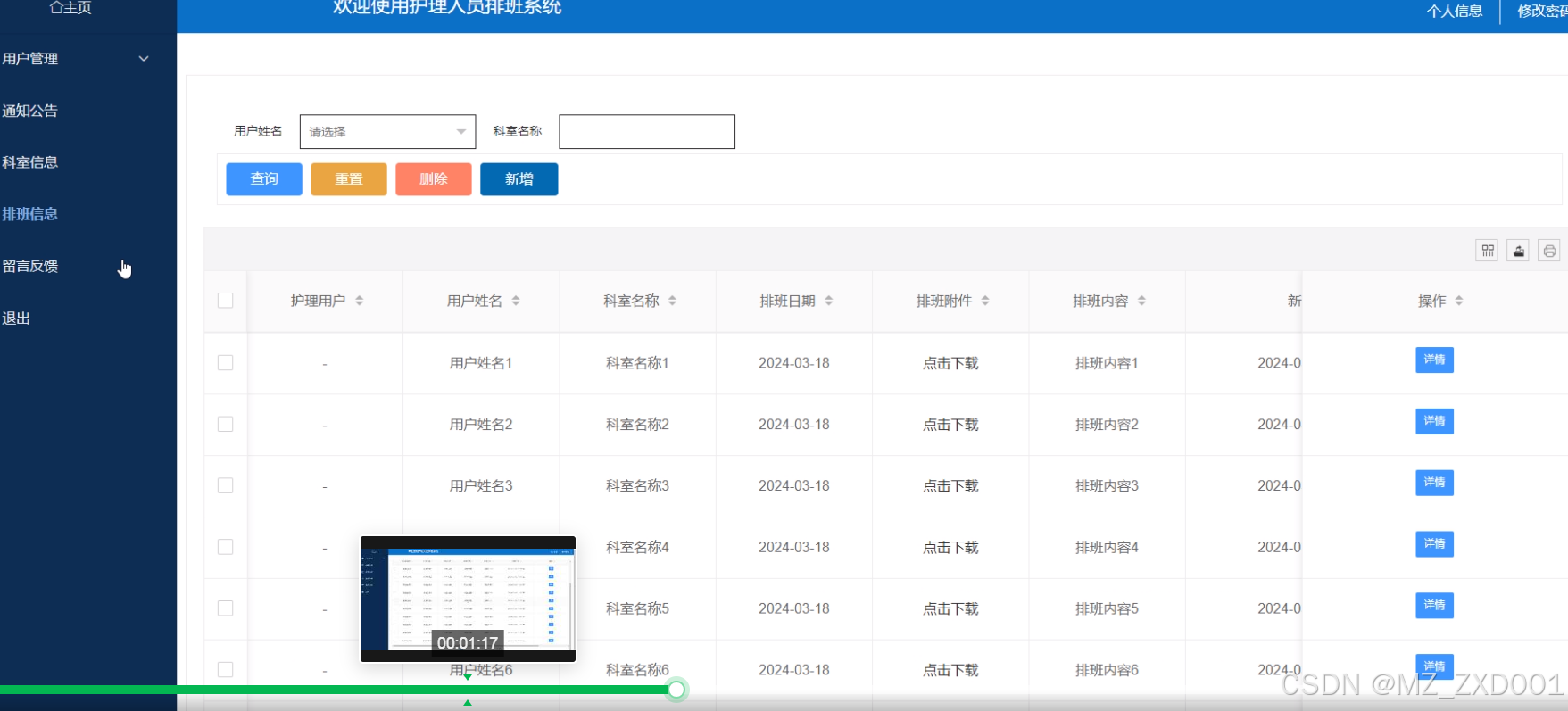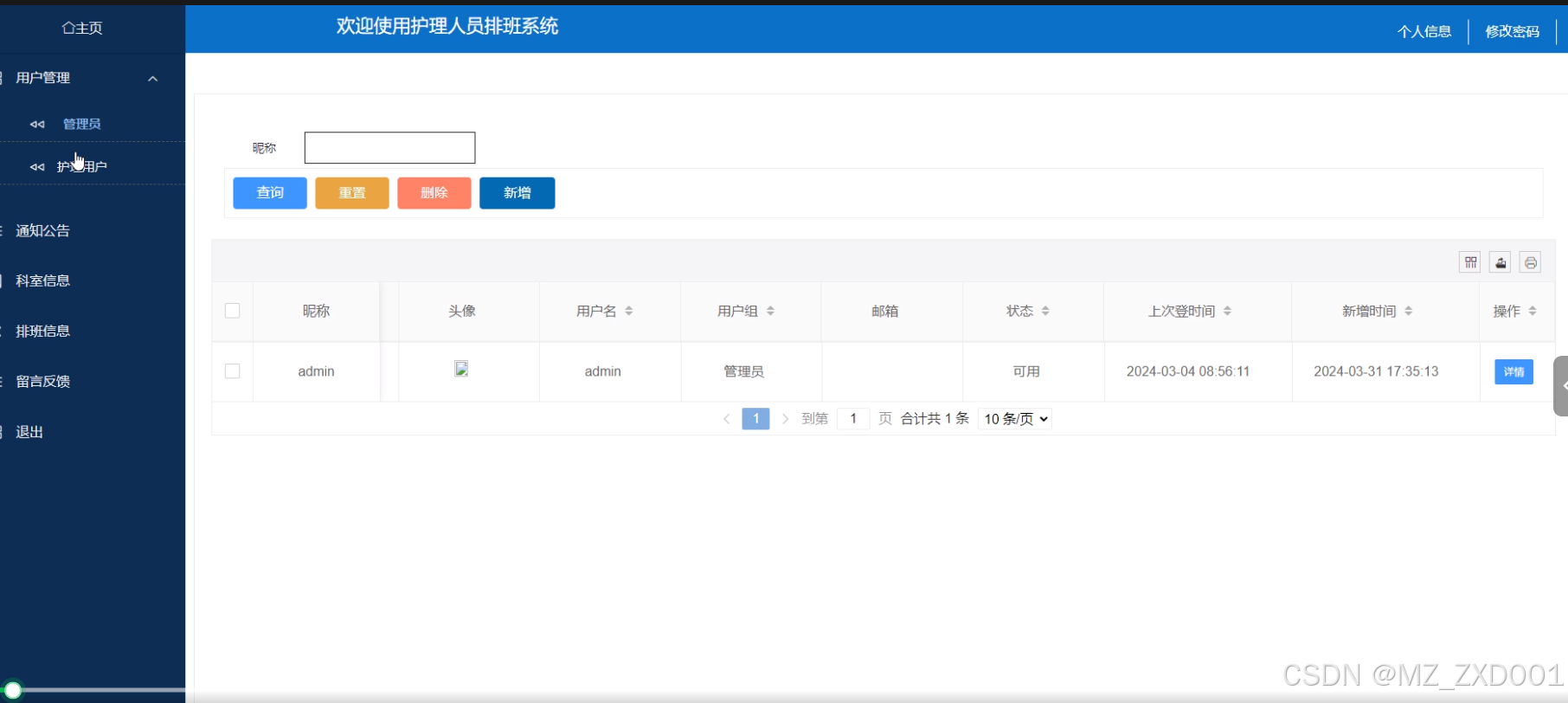 排班信息,管理员可以管理护理人员的排班信息,包括排班安排、班次调整、工作时间管理等操作。如下图所示。