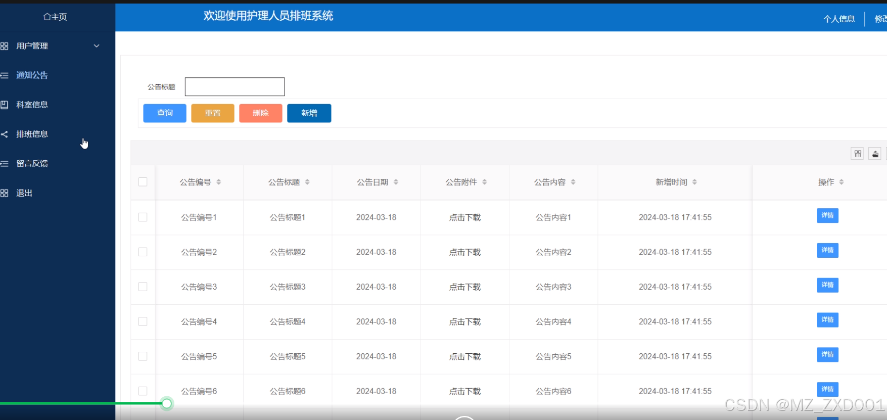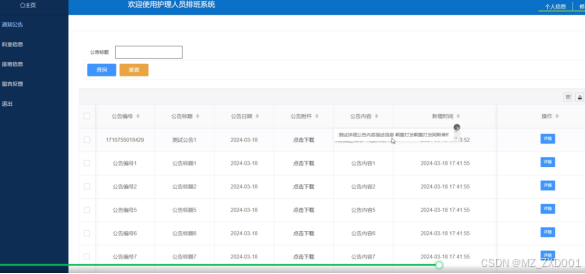 Through the explanation in this article, readers can understand the development process and technical implementation details of a nursing staff scheduling system based on Spring Boot, providing reference and inspiration for developers in related fields. At the same time, the successful application of this system will also have a positive impact on improving the efficiency of hospital scheduling management, optimizing human resource allocation, and improving the quality of nursing services.