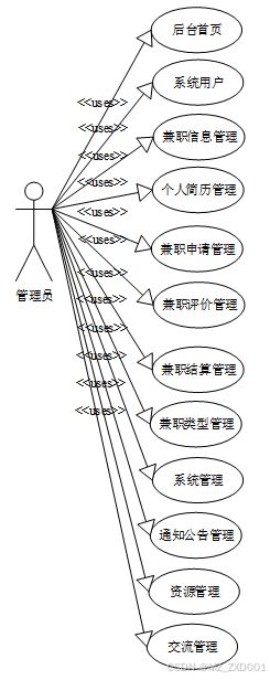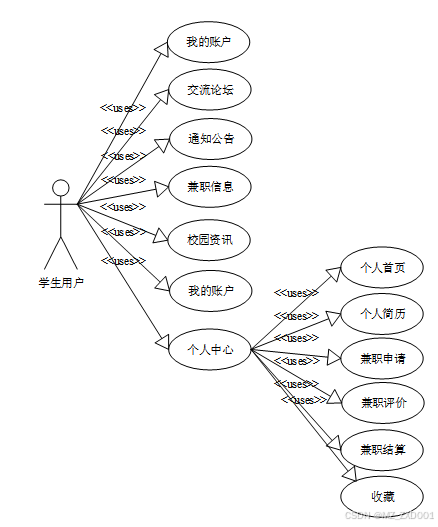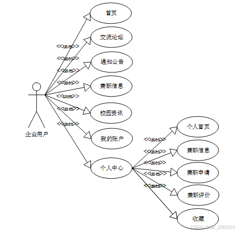 通过以上角色分析,系统可以实现不同用户之间的互动和合作,提供一个便捷、高效的校园兼职服务平台。管理员负责整体管理和维护,企业用户发布兼职岗位,学生用户申请和完成兼职工作,学生处用户监督和管理整个兼职过程。这样的角色划分能够满足各方需求,促进校园兼职市场的发展和学生的就业能力培养。